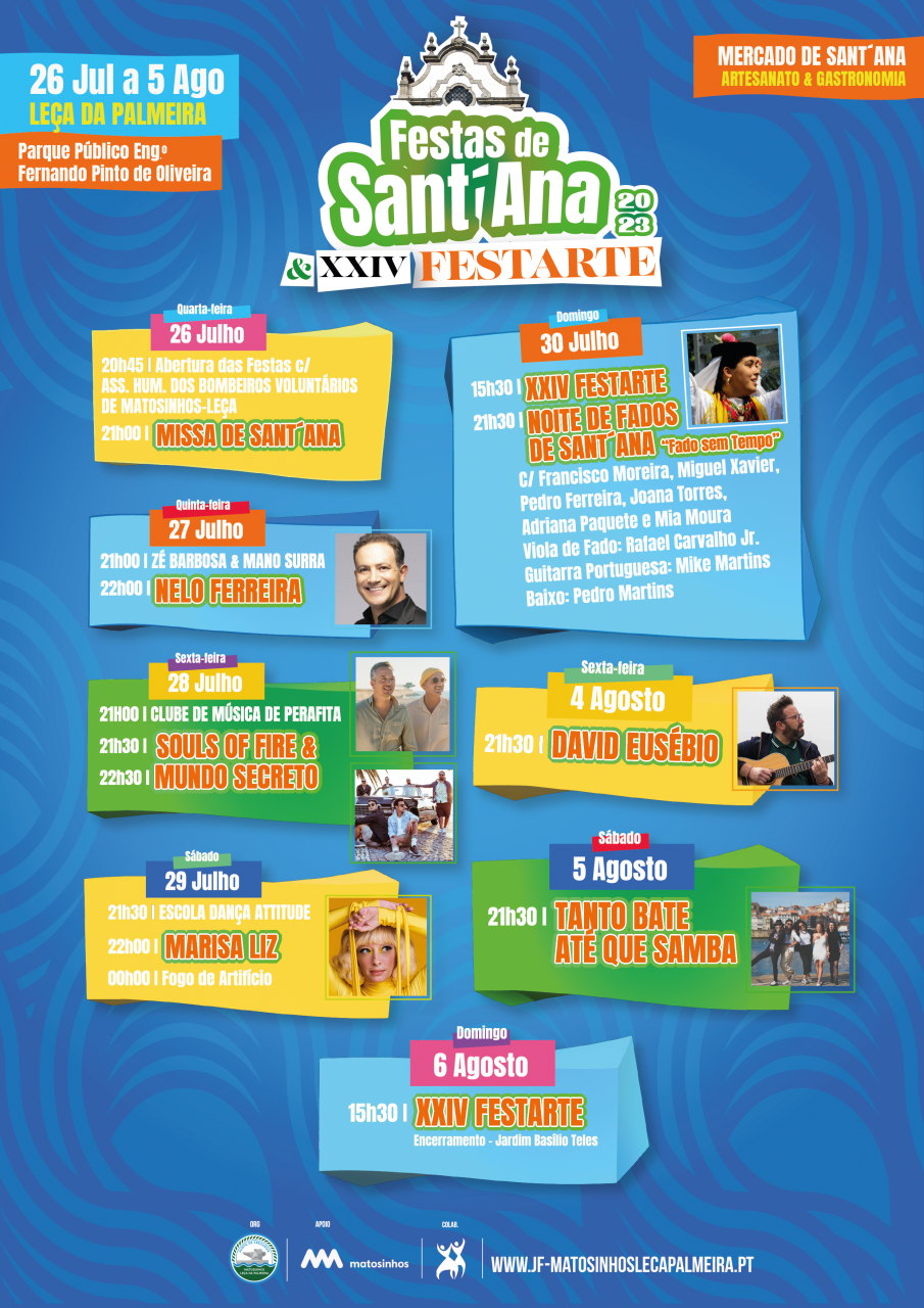 As Festas de Sant´Ana 2023 e o XXIV FESTARTE estão de regresso a Leça da Palmeira. Entre os dias 26 de Julho e 05 Agosto, serão vários, os espetáculos agendados que prometem, uma vez mais, trazer milhares de pessoas ao Parque Engº Fernando Pinto de Oliveira.