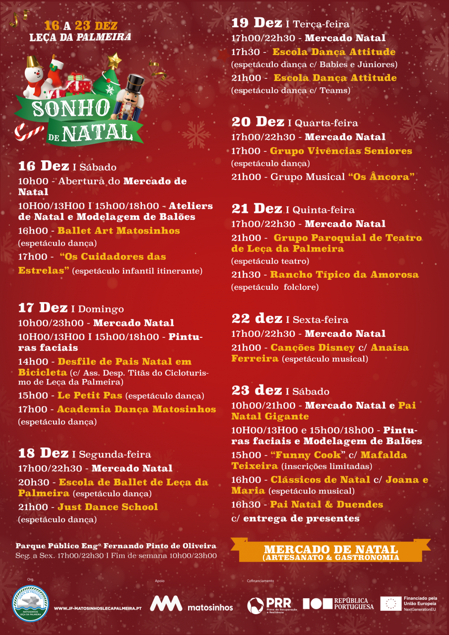 Entre os dias 16 e 23 de Dezembro o Parque Eng.º Fernando Pinto de Oliveira (Leça da Palmeira) recebe mais uma edição do “Sonho de Natal”, uma iniciativa da Junta de Freguesia de Matosinhos e Leça da Palmeira, especialmente concebida para a quadra natalícia.