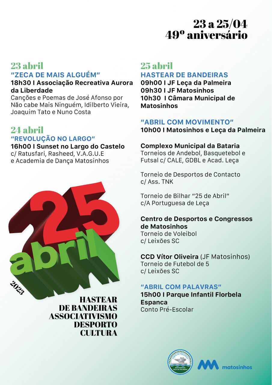 No dia 25 de Abril, as comemorações do 49º aniversário da Liberdade arrancarão com os Hastear de Bandeiras. A cerimónias está marcada para 09h00 em Leça da Palmeira e as 09h30 em Matosinhos. A partir das 10h00, decorrerão também, vários torneios desportivos, dinamizados pelo Leixões SC, Grupo Desportivo de Basquete de Leça, Clube de Andebol de Leça, Académica de Leça, A Portuguesa de Leça FC e Associação TNK. Estas atividades terão lugar no Centro de Desportos e Congressos de Matosinhos, Complexo Municipal da Bataria e Centro de Convívio e Desportivo Vítor Oliveira. Por último, pelas 15h00 está agendado um conto pré-escolar no Parque Infantil Florbela Espanca. “Abril com Palavras” pretende contar a história da revolução de forma didática.